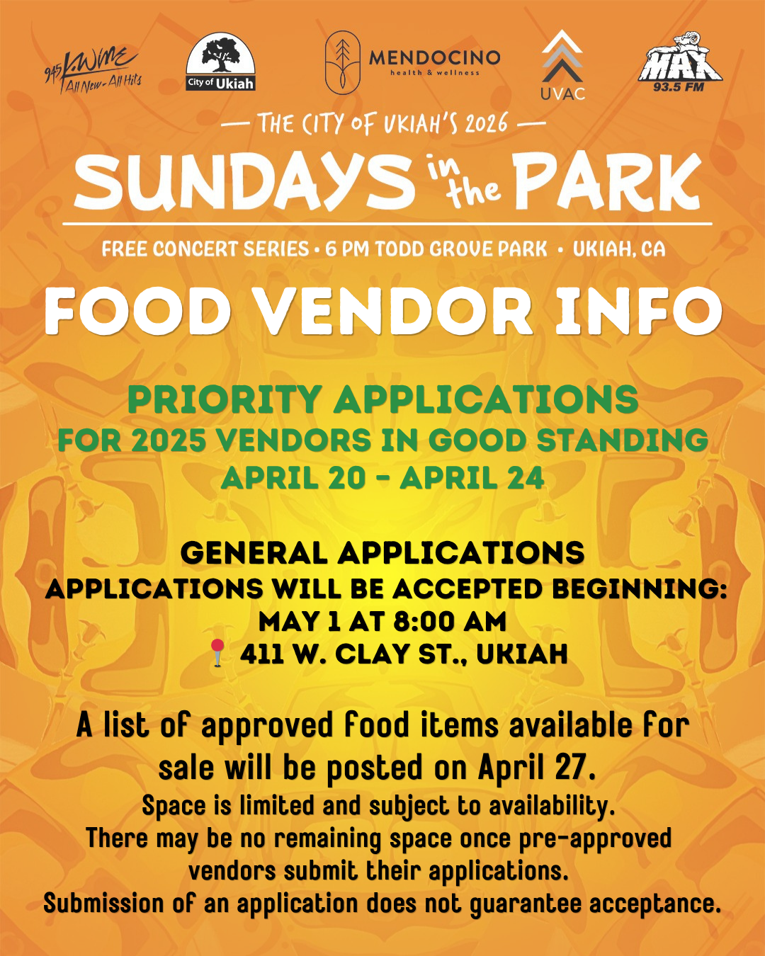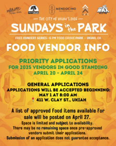 Bring a blanket and gather with your family, friends, and neighbors to enjoy top notch performers while being part of the greater Ukiah community. (Please, no pets and no smoking within the main event area, low-back chairs only, personal BBQ’s only allowed at the picnic table areas. Thank you.) Concerts begin at 6pm. For more information please call 707-463-6231.
