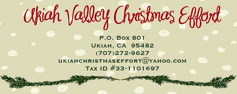 Send donations to the Ukiah Valley Christmas Effort at P.O. Box 801, Ukiah, CA 95482. Learn more by visitng the Ukiah Valley Christmas Effort’s Facebook page or by contacting President Sheryl Graves at (707) 272-9627 or ukiahchristmaseffort@yahoo.com.