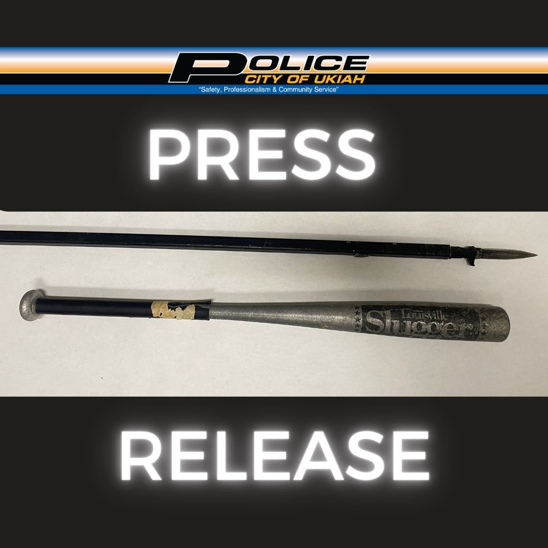 UPD Officers searched the area and found a small, metal, youth-sized Louisville Slugger baseball bat that was thrown in the high weeds just east of the skate park. UPD Officers also located a homemade spear fashioned out of a metal wrought iron fence picket. The spear was approximately 3 feet long with a 3.5-inch double-bladed dagger attached to one end. Nobody in the incident at the Ukiah Skate Park was stabbed or cut.