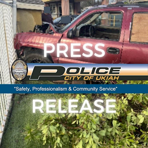 On 01/18/24, at approximately 3:30 pm, Ukiah Police Department (UPD) Officers were dispatched to a hit and run traffic collision at the Days Inn, 950 North State Street. Upon arrival, Officers saw extensive damage to a parked vehicle, trees and a structure belonging to the City of Ukiah and Days Inn. Officers learned the suspect vehicle was northbound on North State Street when it veered to the left, crossed over all lanes of traffic and collided with a vehicle that was parked at the west curb of North State Street. The vehicle then crossed over the sidewalk and uprooted two trees. One of the trees had a trunk diameter of 8-9 inches and was snapped off approximately 2-feet above the root ball. The vehicle then crossed into the parking lot of Days Inn and collided with the pool house, causing structural damage.